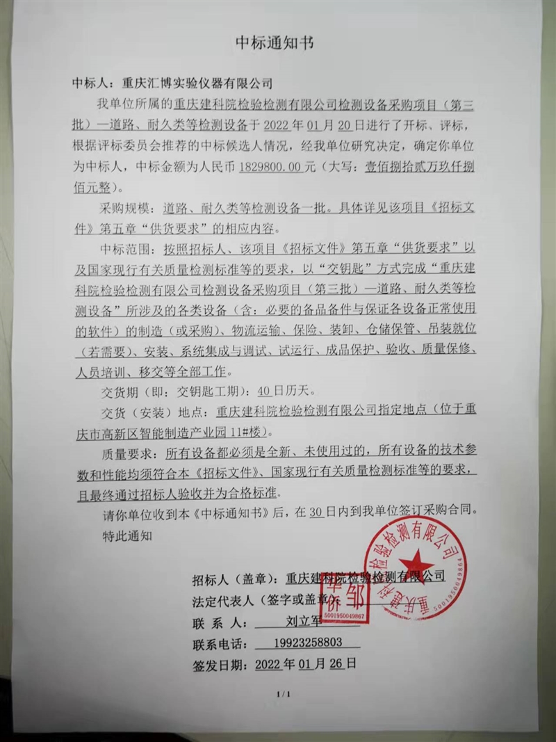 重慶建科院檢驗檢測有限公司委托中招國際招標有限公司對我公司檢測設備采購項目(項目號:TC219D1RL )重慶建科院檢驗檢測有限公司檢測設備采購項目(第三批)—道路、耐久類等檢測設備進行了公開招標采購,現已完成全部采購程序。確認重慶匯博實驗儀器設備有限公司為檢測設備采購項目(第三批)—道路、耐久類等檢測設備中標人,中標價為1829800.00元(大寫:壹佰捌拾貳萬玖仟捌佰元整)。