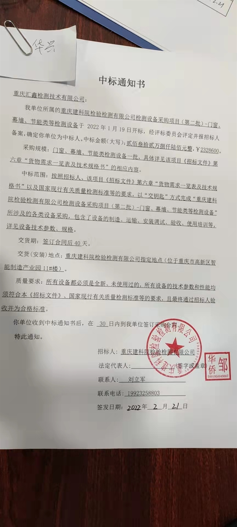 重慶建科院檢驗檢測有限公司委托重慶華興工程咨詢有限公司對我公司檢測設備采購項目(項目號:HXZX-2021-30 )重慶建科院檢驗檢測有限公司檢測設備(第二批)-門窗、幕墻、節能類等檢測設備進行了公開招標采購,現已完成全部采購程序。確認重慶匯鑫檢測技術有限公司為檢測設備(第二批)-門窗、幕墻、節能類等檢測設備采購項目中標人,中標價為2328600元(大寫:貳佰叁拾貳萬捌仟陸佰元整)。