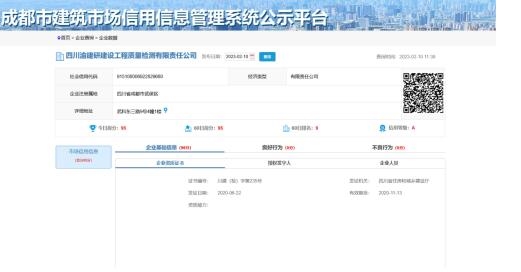 根據2021年印發的《成都市建設工程質量檢測機構及檢測人員信用評價管理辦法》,成都市建筑市場信用信息公示平臺綜合考慮檢驗檢測機構在經營期間各項表現,獲得表彰、人員管理、設備管理、檢驗檢測環境管理、檢測能力驗證、檢測報告管理、資質運行等26個項目進行評價,力求全面客觀評價檢驗檢測機構綜合能力。信用評級結果分為4,最高等級為A類,表示誠信度較高、各項評價指標較好、質量管理水平較好、社會信譽較高。