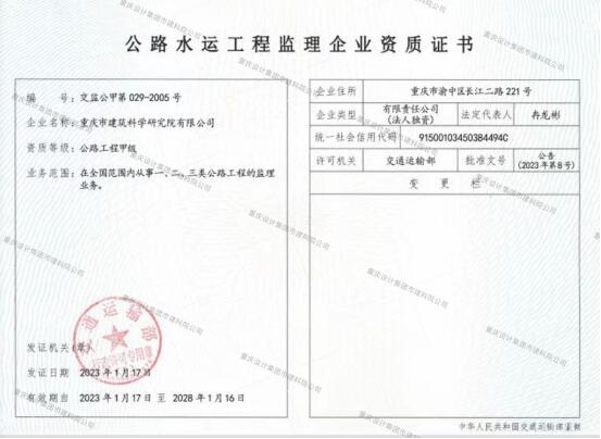 重慶設(shè)計集團(tuán)市建科院公司公路水運(yùn)工程監(jiān)理甲級資質(zhì)順利通過重新核定