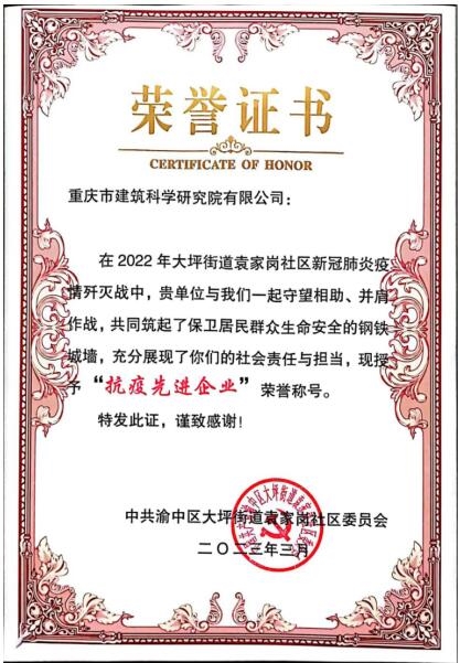323日,大坪街道召開“疫”路有你,與愛同行——暨抗疫“最美黨員”表彰大會,為在2022年大坪街道袁家崗社區新冠肺炎疫情殲滅戰中表現優秀的社會團體與個人頒發榮譽證書,市建科院公司獲“抗疫先進企業”榮譽稱號。