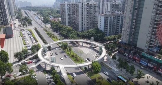 新城馨苑人行天橋位于江北區(qū)盤溪路與福源路、余溪南路交叉口。天橋全長(zhǎng)約為220米,橋面總寬4.4米,設(shè)計(jì)8個(gè)梯道,4部垂直升降電梯。天橋整體為圓環(huán)狀設(shè)計(jì),大氣美觀且頗具功能性,在實(shí)現(xiàn)人車分流的同時(shí),也讓市民過(guò)馬路更方便、安全。