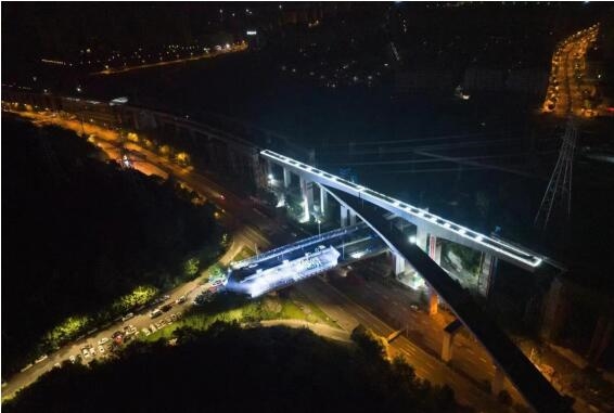 為最大程度減少對運營線路的影響,縮短建設工期,保障施工安全,項目部決定采用橋梁轉體工藝進行施工,即在6號線兩側將T構連續梁澆筑完成,以橋墩為軸逆時針轉體,跨越既有6號線進行對接。728156分,6號線東延工程劉家坪站至百樂園站高架區間的兩座T構連續梁轉體橋開始轉體施工經過52分鐘的轉體作業后,實現精準對接,這既是6號線東延工程高架區間首座連續梁轉體,也是重慶軌道交通領域首次實現連續梁跨越既有軌道交通線路轉體,為后續類似施工提供了范本。