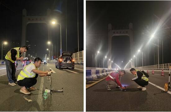 鵝公巖長(zhǎng)江大橋是重慶主城區(qū)橫跨長(zhǎng)江連接九龍坡區(qū)和南岸區(qū)的重要特大橋梁,是快速抵達(dá)成渝高速和渝黔高速的主要通道,大橋?yàn)殡p向八車道,于2000年12月建成通車。近年來(lái),隨著車流量急速增長(zhǎng)及重車通行,橋面瀝青鋪裝層產(chǎn)生較多病害,可能影響使用壽命。為全面掌握橋面鋪裝層病害狀況,檢測(cè)中心選派豐富經(jīng)驗(yàn)的檢測(cè)人員提前收集項(xiàng)目資料,協(xié)商交通組織方案并編制檢測(cè)方案,保證任務(wù)順利開展。全體檢測(cè)人員高度重視夜間工作的安全問(wèn)題,布設(shè)大量交通導(dǎo)行標(biāo)牌、施工限速標(biāo)志等交通設(shè)施,全員穿反光背心、佩戴安全警示燈進(jìn)行病害分布、平整度、摩擦系數(shù)、構(gòu)造深度等指標(biāo)的檢測(cè),確保數(shù)據(jù)的真實(shí)性和準(zhǔn)確性。最終檢測(cè)數(shù)據(jù)和狀況評(píng)估以報(bào)告編制工作會(huì)的形式發(fā)布,為鋪裝層病害專項(xiàng)整治專項(xiàng)設(shè)計(jì)提供了技術(shù)依據(jù),為后續(xù)的橋面鋪裝層病害整治方案制定提供了科學(xué)支撐。