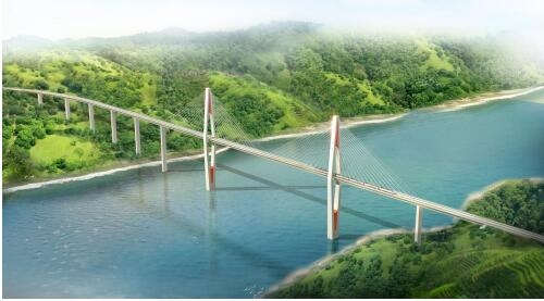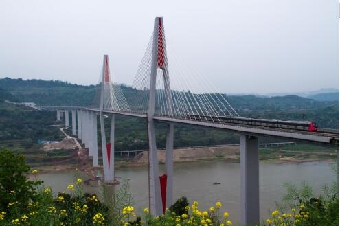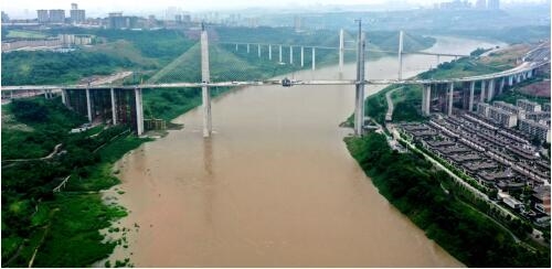 蔡家嘉陵江軌道專用橋為雙線軌道雙索面斜拉橋,全長1250米,由南北引橋和主橋組成,橋跨為連續(xù)梁、雙索面斜拉橋、連續(xù)鋼構引橋組成,其中主橋長640米、主跨250米、主橋面距河床距離100米。在設計時兼顧了功能性、景觀性以及可實施性,最終選擇了與環(huán)境協(xié)調(diào),經(jīng)濟實惠、施工可實施性強的斜拉橋,由于橋墩高、橋面窄,主橋?qū)挾认鄬τ谄胀ǖ目缃反髽蚋?,橋身顯得纖細,在云霧中呈現(xiàn)婀娜多姿的柔美姿態(tài)。
