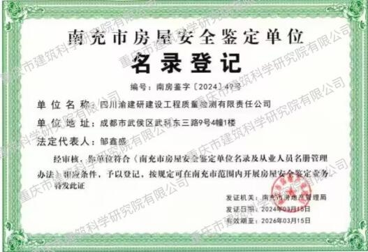 該項名錄登記單位資格的取得,標志著四川渝建研公司在房屋安全鑒定領域的專業資質和實力得到了南充市相關部門的認可,公司將有更多機會參與到南充市各類房屋安全鑒定項目中,為更多客戶提供專業、高效的服務。