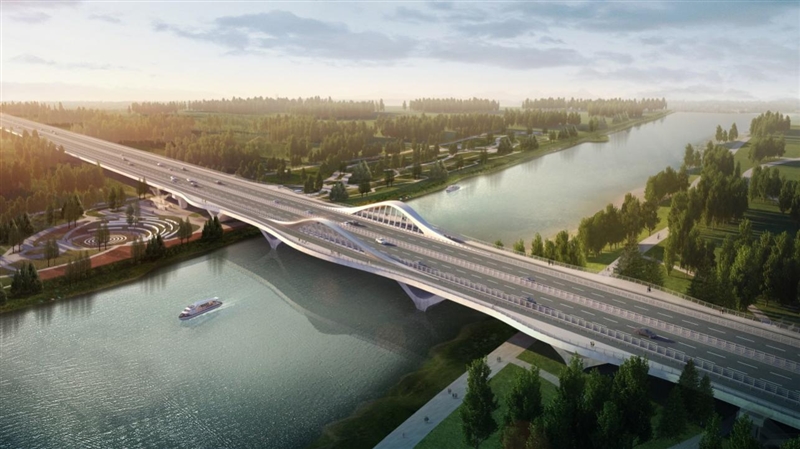 主橋設(shè)計采用梁-拱型組合體系,立意“荷香”,將荷葉形態(tài)融入到橋梁造型當(dāng)中,荷葉浮于運河之上,整個造型宛如運河上盛開的荷花,生態(tài)自然,與環(huán)境融為一體,給人以生機(jī)盎然、自然和諧的美感。