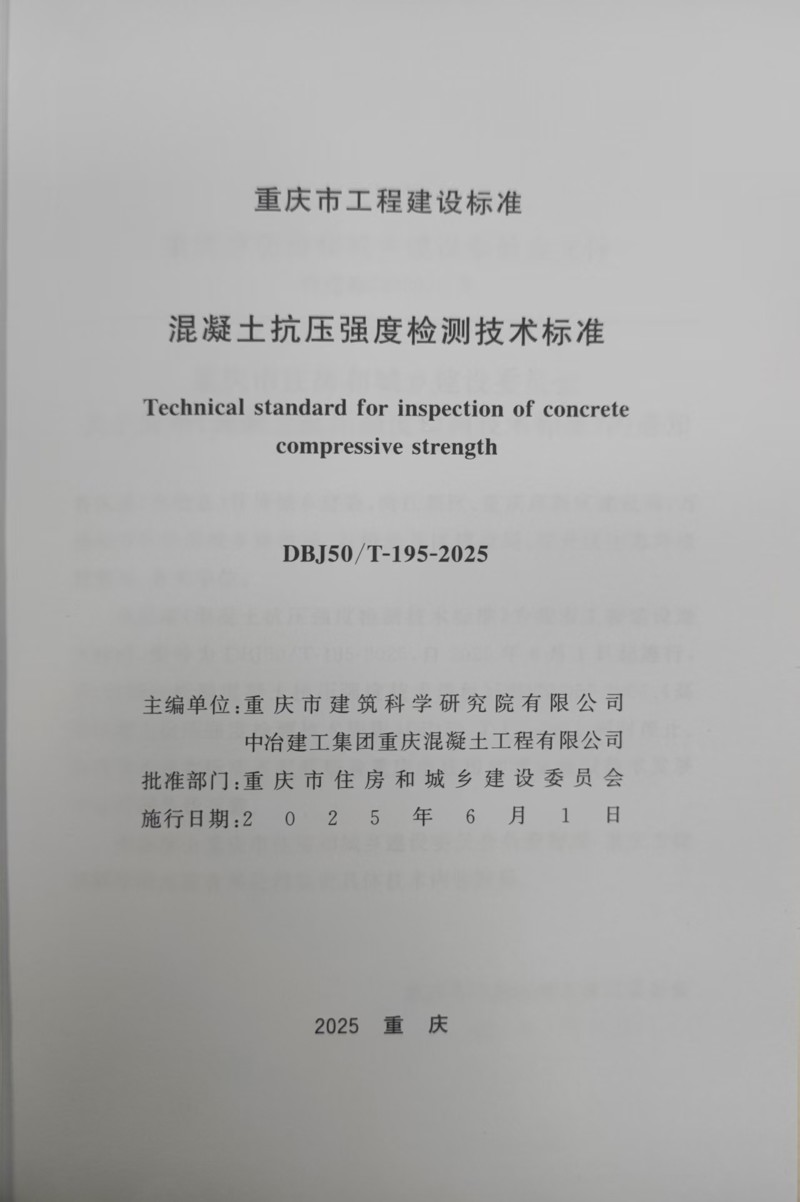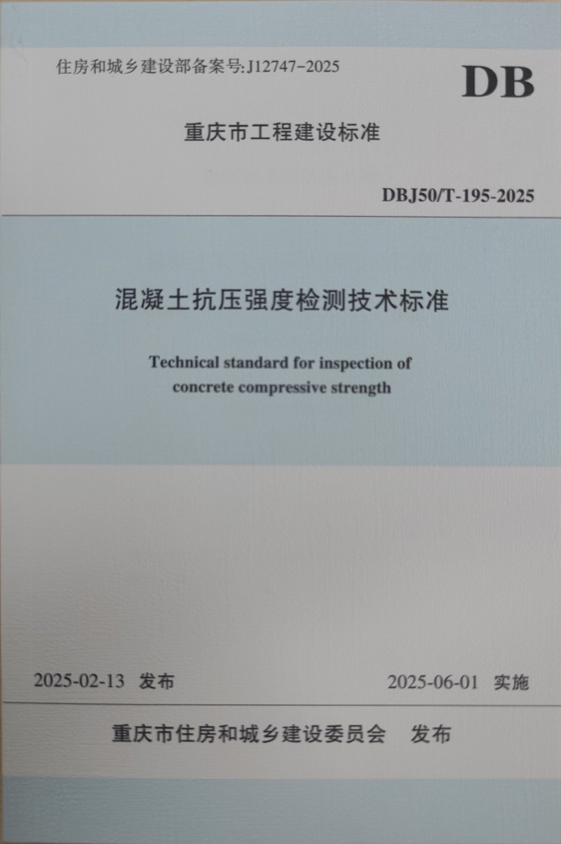近日,由重慶設計集團所屬子企業重慶市建筑科學研究院有限公司(以下簡稱“市建科院”)聯合中冶建工集團重慶混凝土工程有限公司主編的重慶市《混凝土抗壓強度檢測技術標準》(DBJ50/T-195-2025)(以下簡稱《標準》)正式發布,經重慶市住房和城鄉建設委員會批準,將于2025年6月1日正式實施。