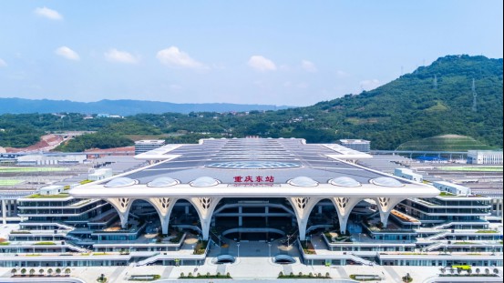 重慶東站位于南岸區茶園新區東南側,站房樞紐總建筑面積達122萬平方米。作為國家“八縱八橫”高速鐵路網的重要交匯點和重慶構建“米”字型高鐵網的關鍵節點,它是西部地區最大的鐵路樞紐,也是國家交通強國“站城一體化發展”試點項目。重慶東站將引入渝廈、渝萬、成渝、渝貴、渝昆等高鐵、樞紐東環線普鐵以及4條軌道交通線,實現鐵路、軌道、公交、長途等多種交通方式的“零換乘”。這座現代化綜合交通樞紐已成為重慶“新地標”,顯著提升了城市運行品質,改善了旅客出行環境,拉動了周邊區域發展活力,對助力成渝地區雙城經濟圈建設意義重大。